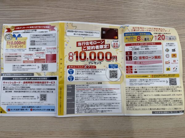 三菱UFJ銀行から届いた住宅ローン契約者向けのダイレクトメール。三菱UFJカードを新規に作成すると現金1万円をもらえるという内容。