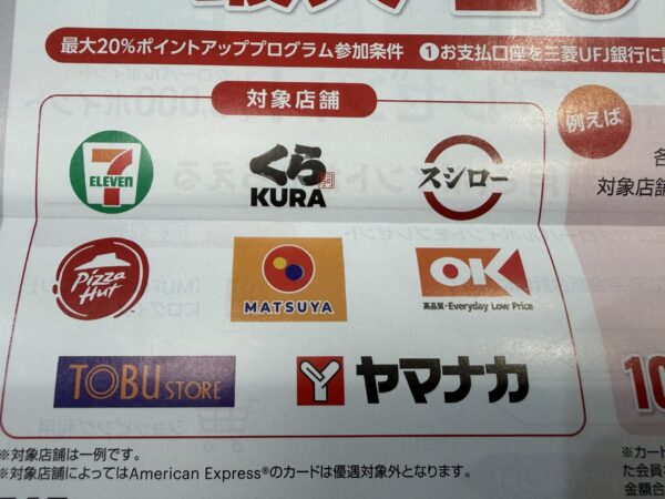 三井住友カードと三菱UFJでは高還元対象店舗の重複が少ない。1万円もらえるし、2枚持ちもアリかと考えるように。個人的に利用率の高い、くら寿司、スシロー、松屋が含まれていたので、結局申し込むことに。
