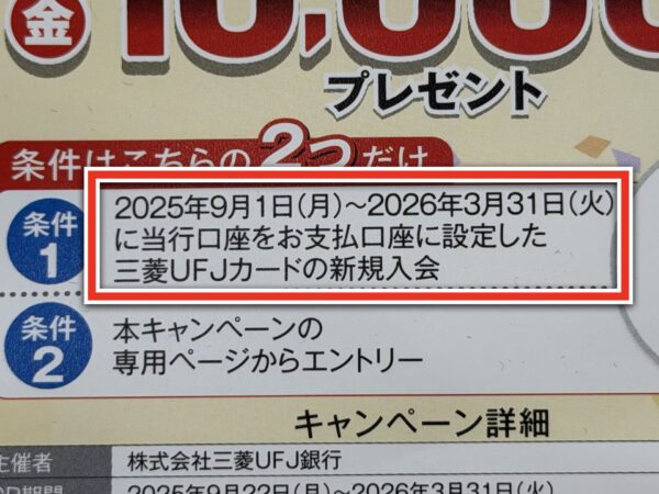 三菱UFJ銀行からの案内なのに、みずほ銀行の口座を設定・・・・。これでは条件対象外。後から、三菱UFJに変更したけど、おそらくダメだろうな・・・。